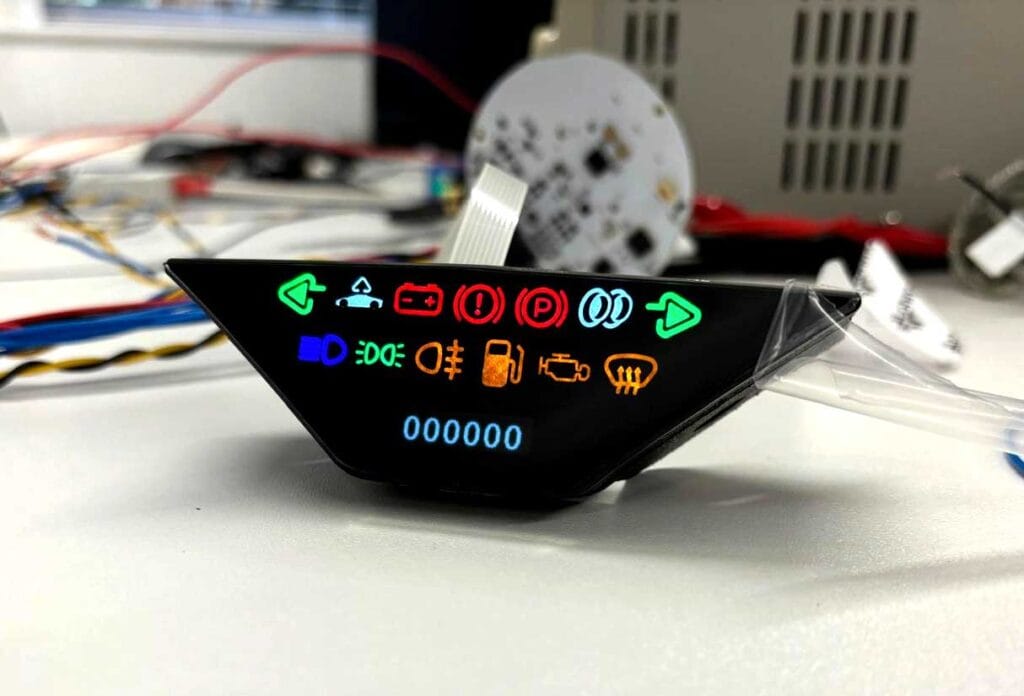 Peterson Instrument Co.’s CAN bus software has been implemented for accuracy and precision and the pointers sweep in crossing paths upon startup. Pointer dynamics are tuned for each measurement, with a crisp snap-action of the gearchange vs the damped auxiliary gauges.