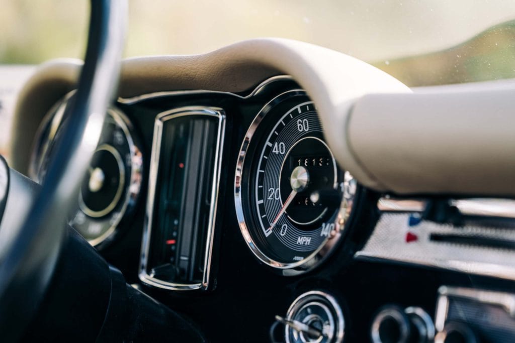 Timeless, classic, front-lit gauges with a minimal style for vintage cars typically from the 1950s to 1970s.