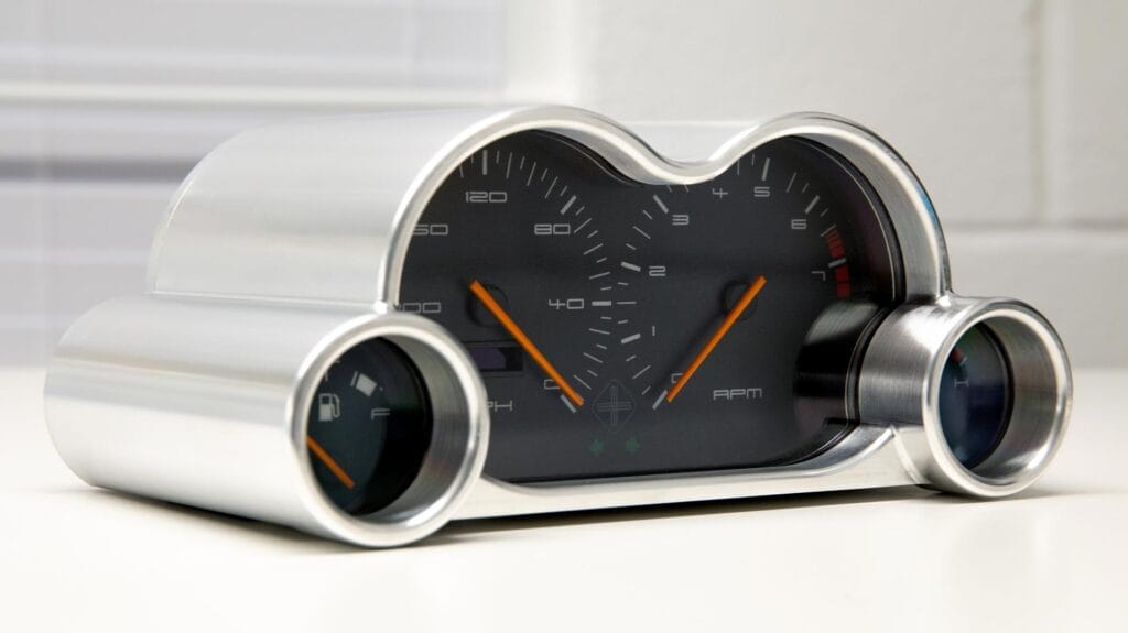 From render to reality, this bespoke billet aluminium instrument cluster has come to life and is bursting with modern features. To aid in the symmetry of the cylindrical cluster, a reverse analogue speedometer was designed to give good visibility, while adding an exciting twist. A complicated light-guide design provides flood lighting to the pointers, while retaining more modern backlit chaplets. Peterson Instrument Co. also chose Hidden-Until-Lit ‘HUL’ warning lights instead of the prototype’s individual physical lamps, which we felt took up a lot of space on the cluster. HUL lights also have a minimalist design to the gauge faces and means the whole binnacle now runs on just 5 wires.